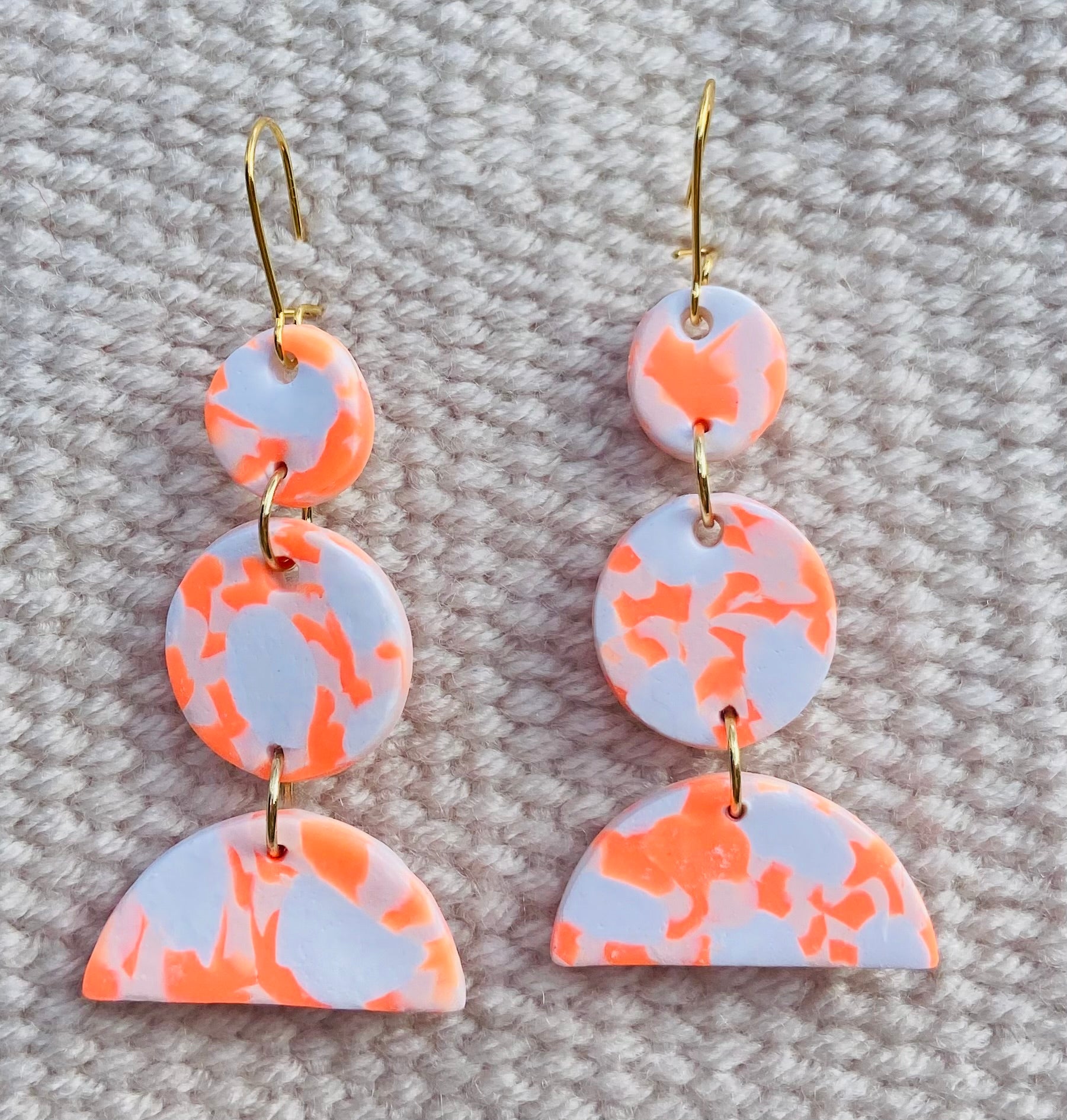 Handmade orange and white 'Neon moon' polymer clay earrings. These uniquely patterned earrings feature 18k gold plated brass hooks.