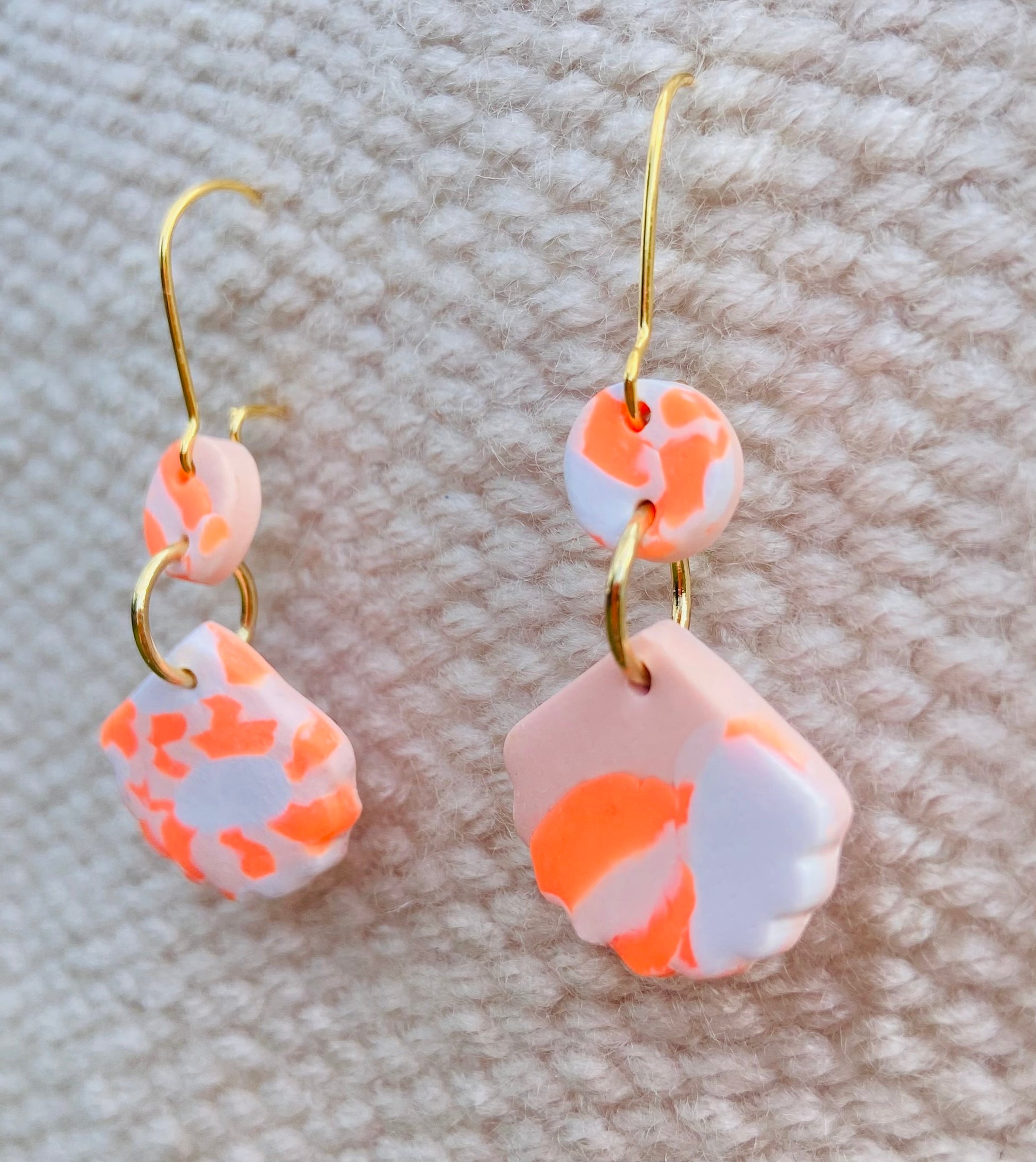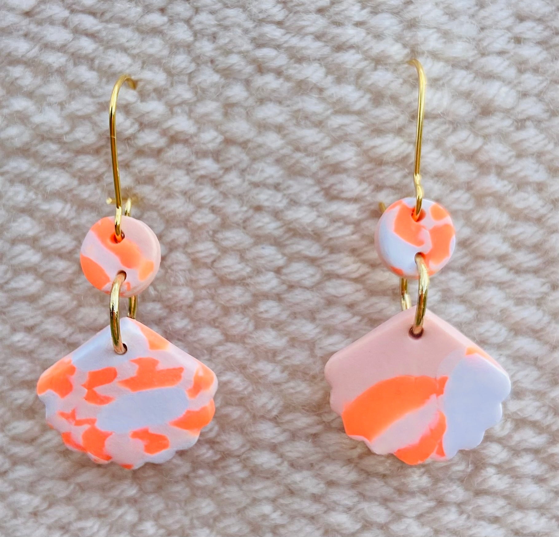Add a playful pop of colour to your outfit with our Neon Shell earrings. Handcrafted from neon orange and white polymer clay, these earrings are unique in their pattern and perfectly lightweight. 18k gold plated brass hooks.