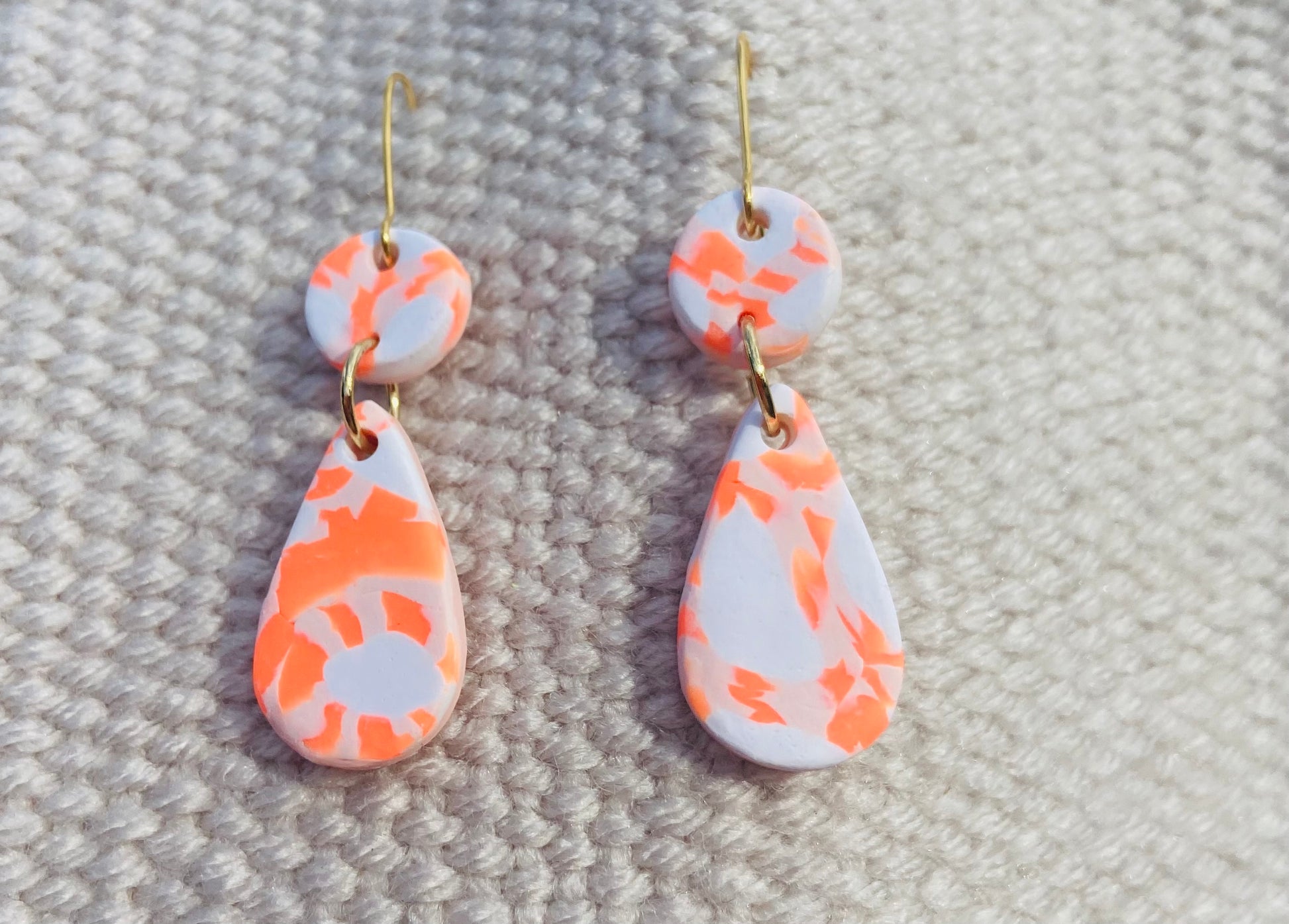 Add a colourful touch to your look with Neon Teardrops! These handmade earrings feature unique patterned neon orange and white clay, and are lightweight and comfortable to wear. With 18k gold plated brass hooks, they measure 4cm x 2cm.