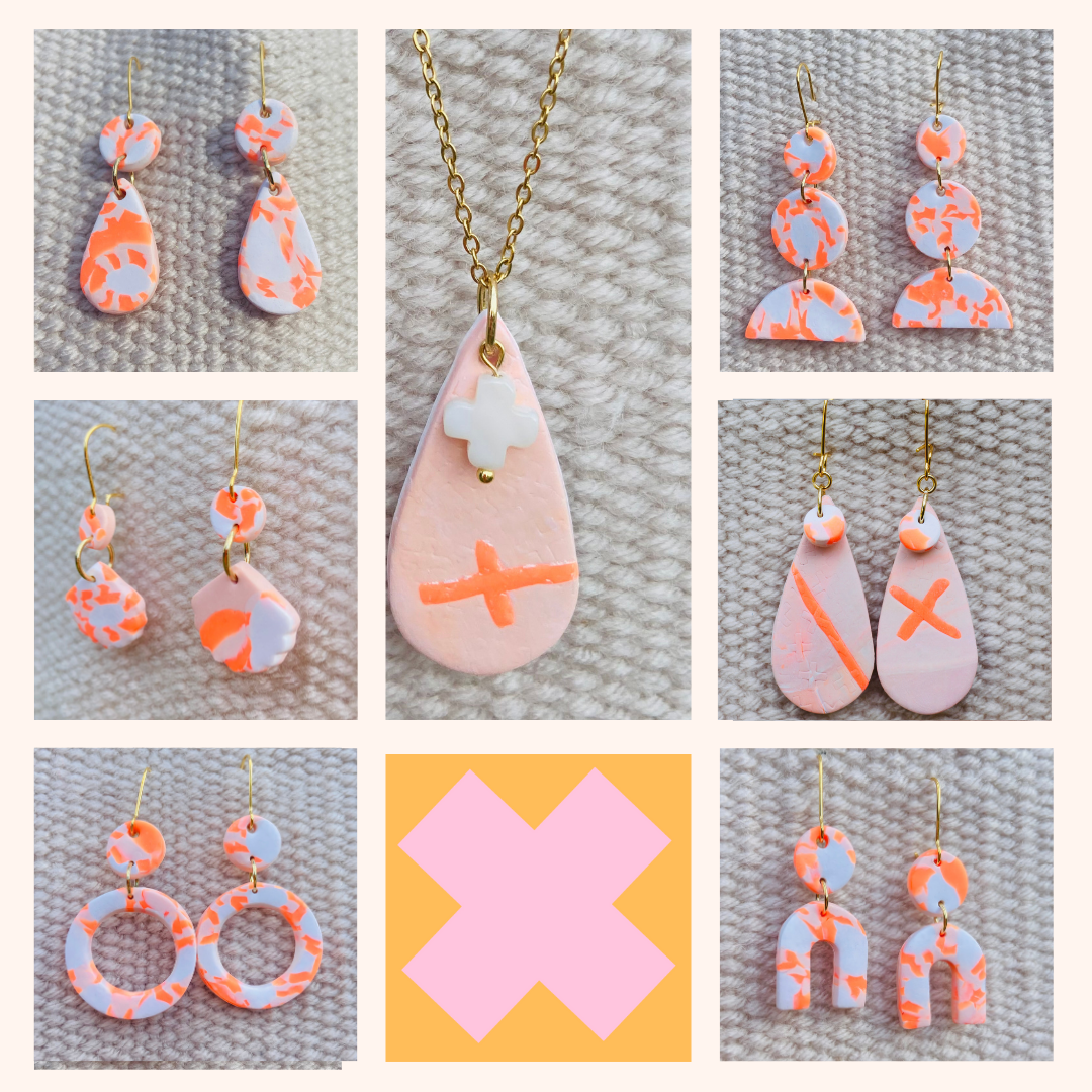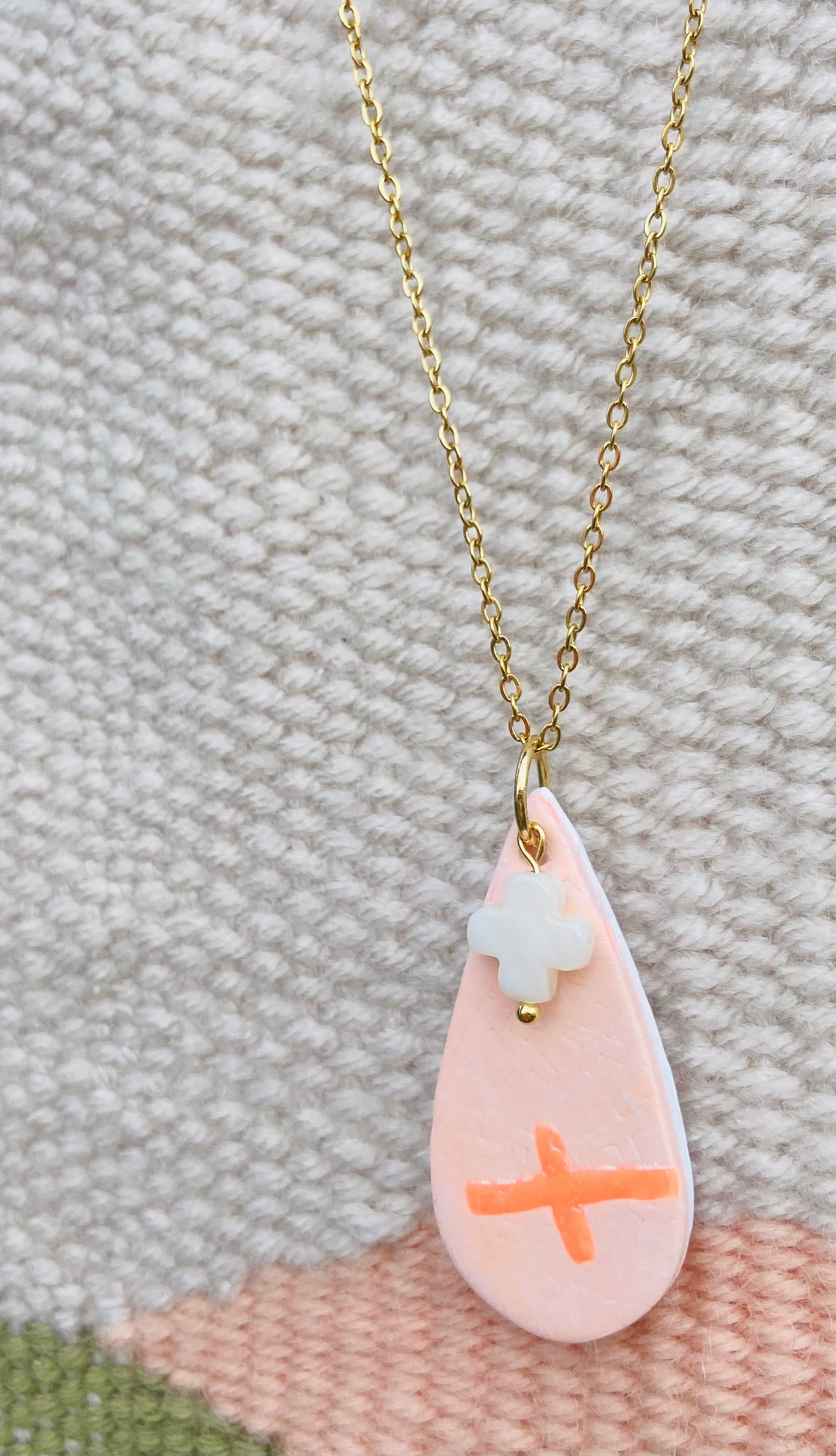 This beautiful 45 cm necklace features a light weight tear drop pendant, handmade with polymer clay in a dusty pink hue. Accented with a pop of orange neon and a cross charm. The 18k gold plated stainless steel chain adds elegance to this unique piece that is designed to mix and match with my other designs.